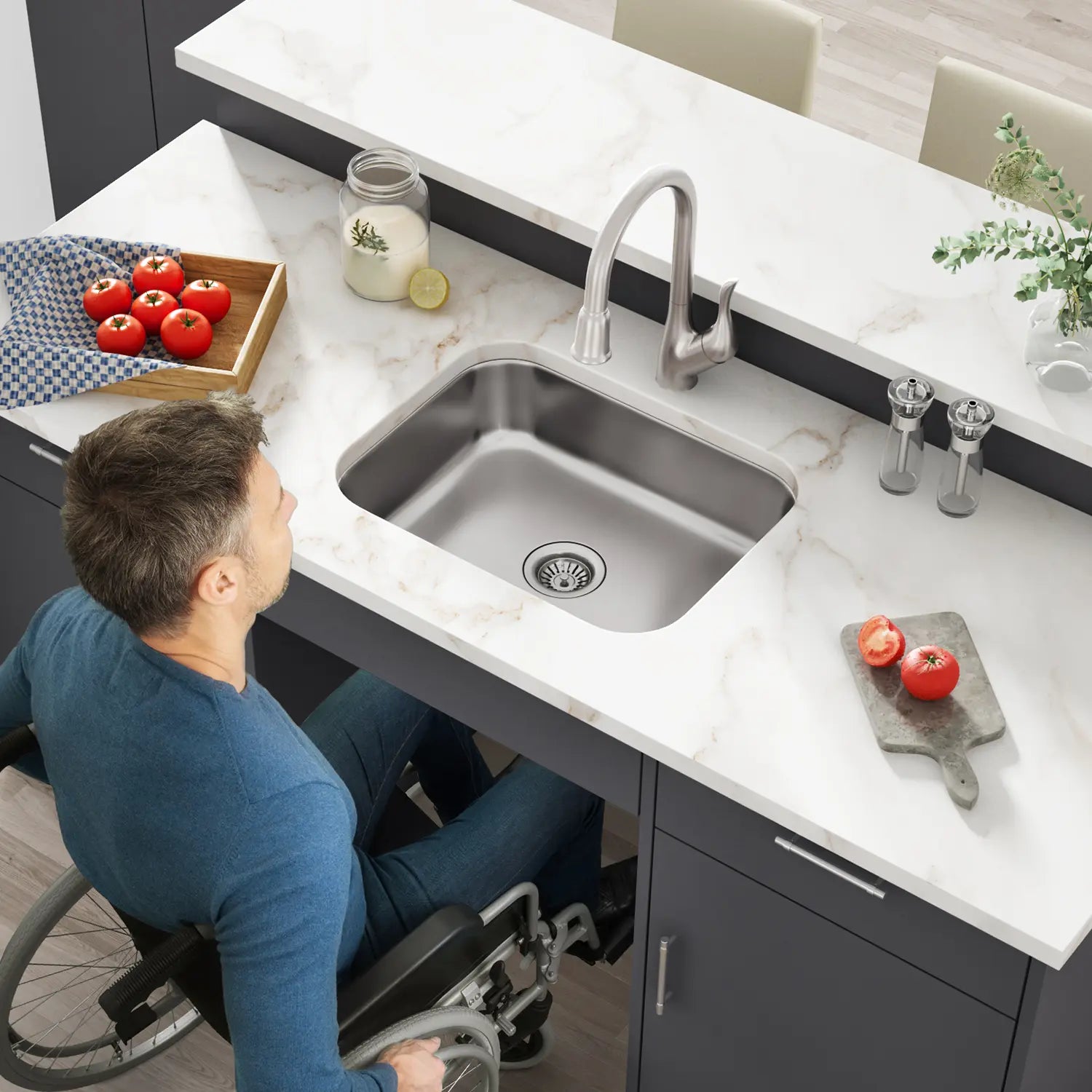 ADA-compliant kitchen sinks, bathroom sinks, faucets, and shower systems that share the same product families and finishes as standard fixtures. Accessible units don’t require separate sourcing or a parallel fixture budget — they’re part of the same per-unit cost model.