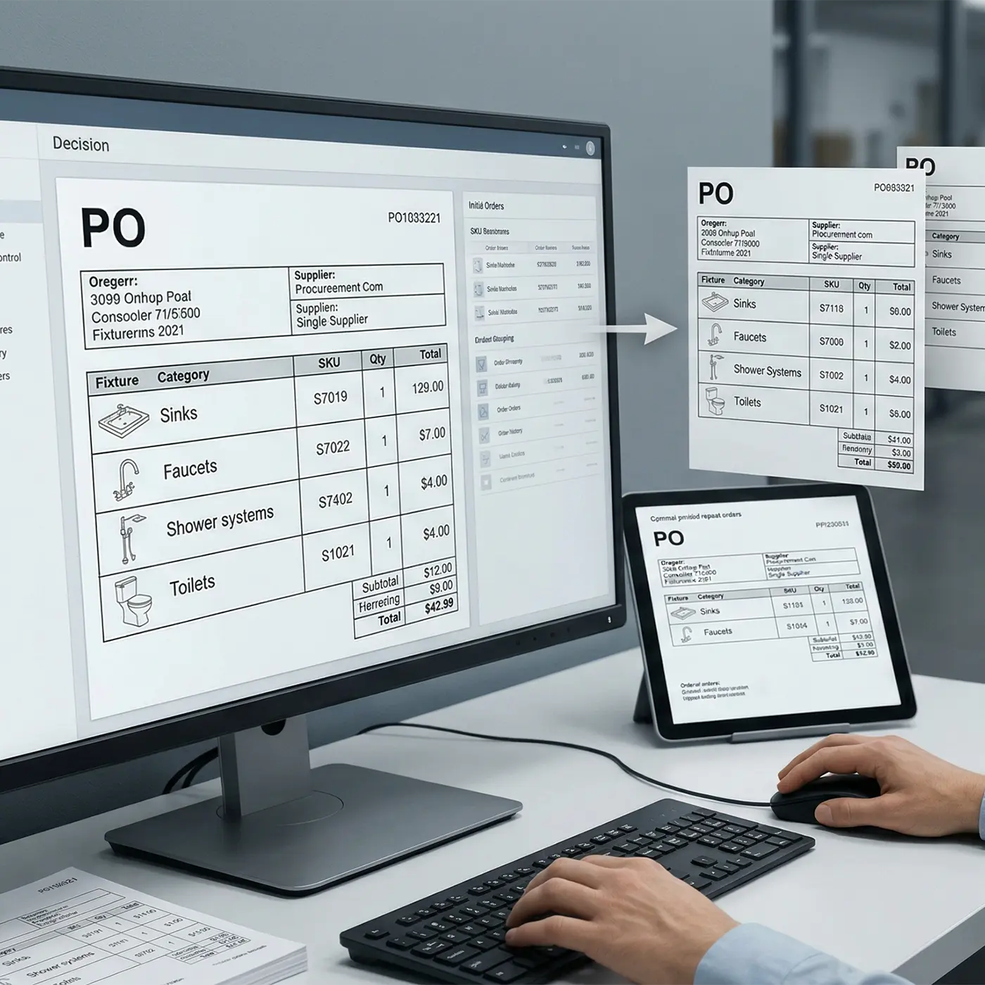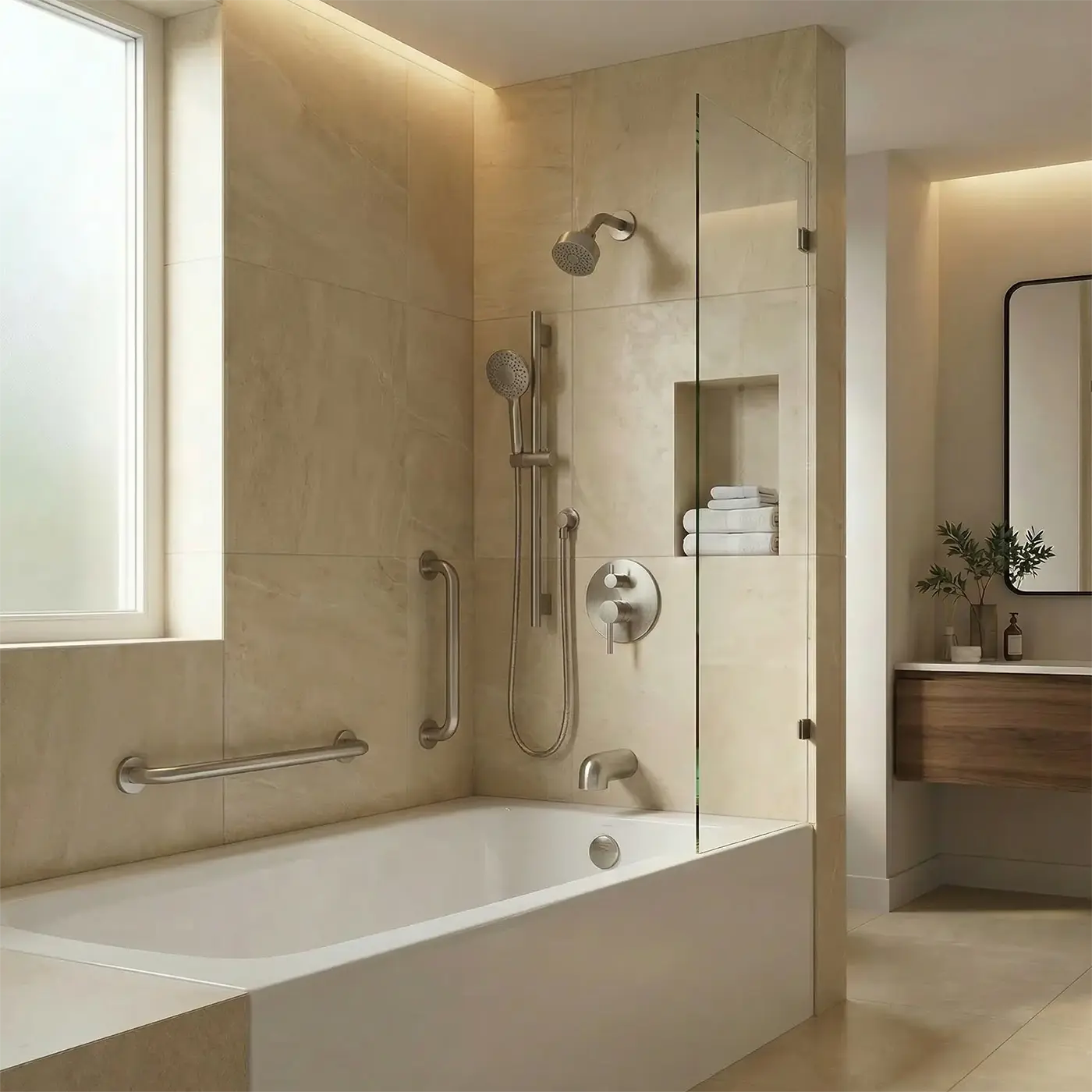 Toilets, grab bars, towel bars, robe hooks, and toilet paper holders in coordinated finishes. Accessories are the category most likely to get sourced from a separate vendor — a separate PO for products that cost $15–$30 each. The overhead of managing a vendor for accessories often costs more than the accessories themselves.
