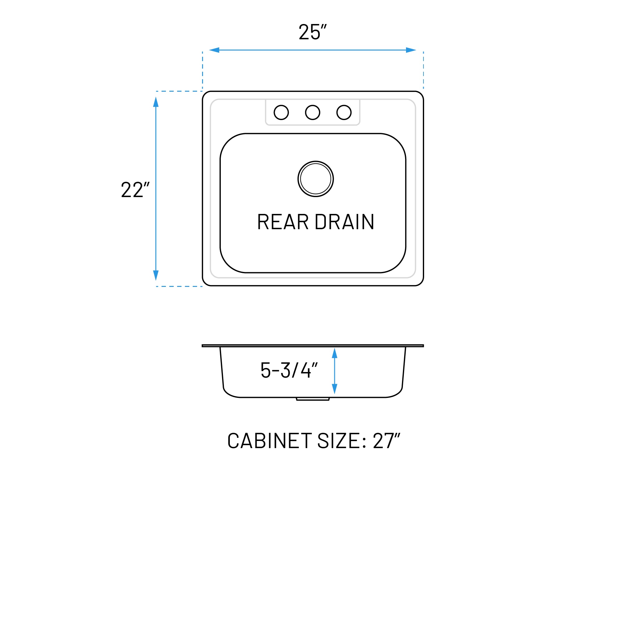 25" Top Mount Stainless Steel 3-Hole Single Bowl ADA Kitchen Sink, ADA-TOP-2522-S