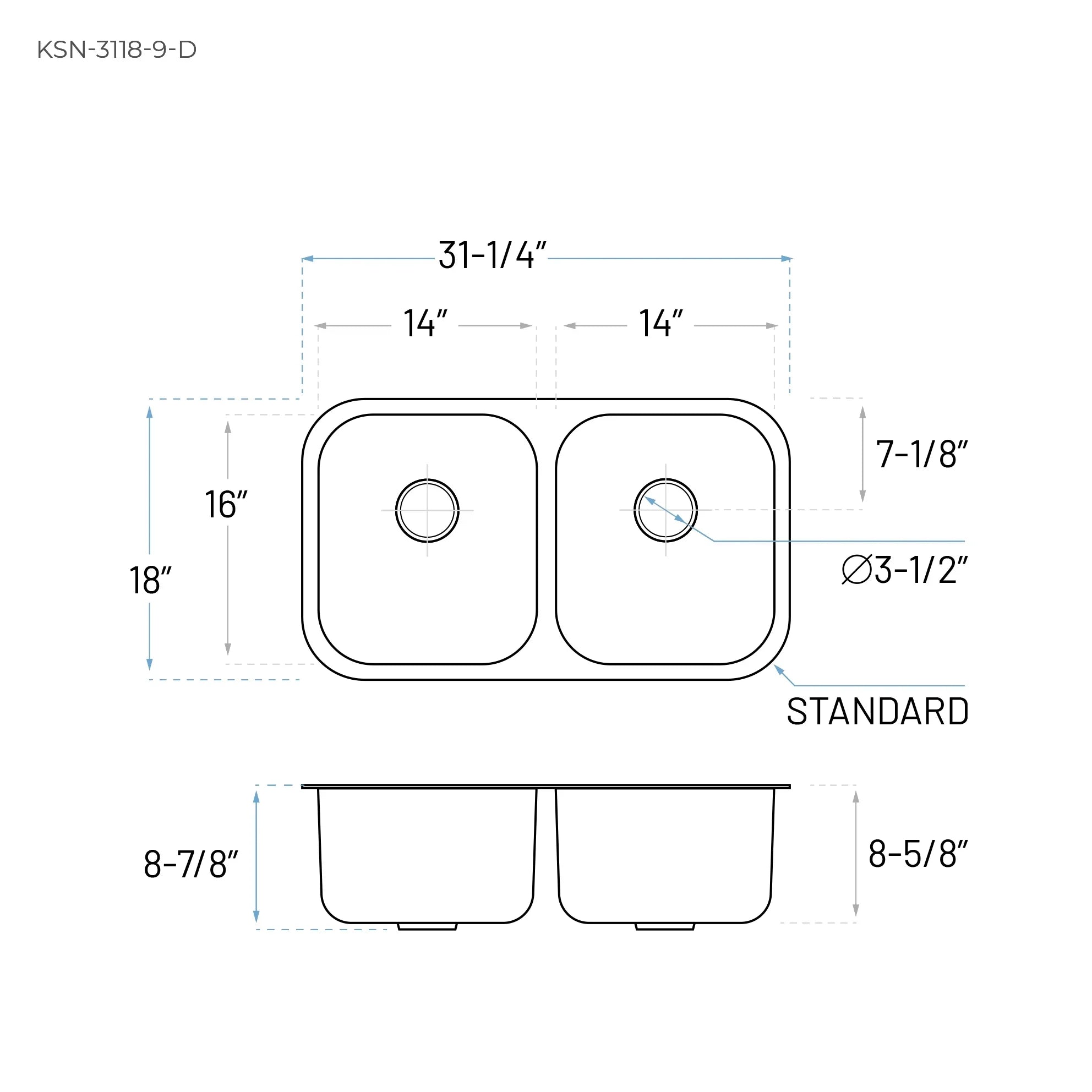 31" Undermount Double Bowl Stainless Steel Kitchen Sink, KSN-3118-9-D