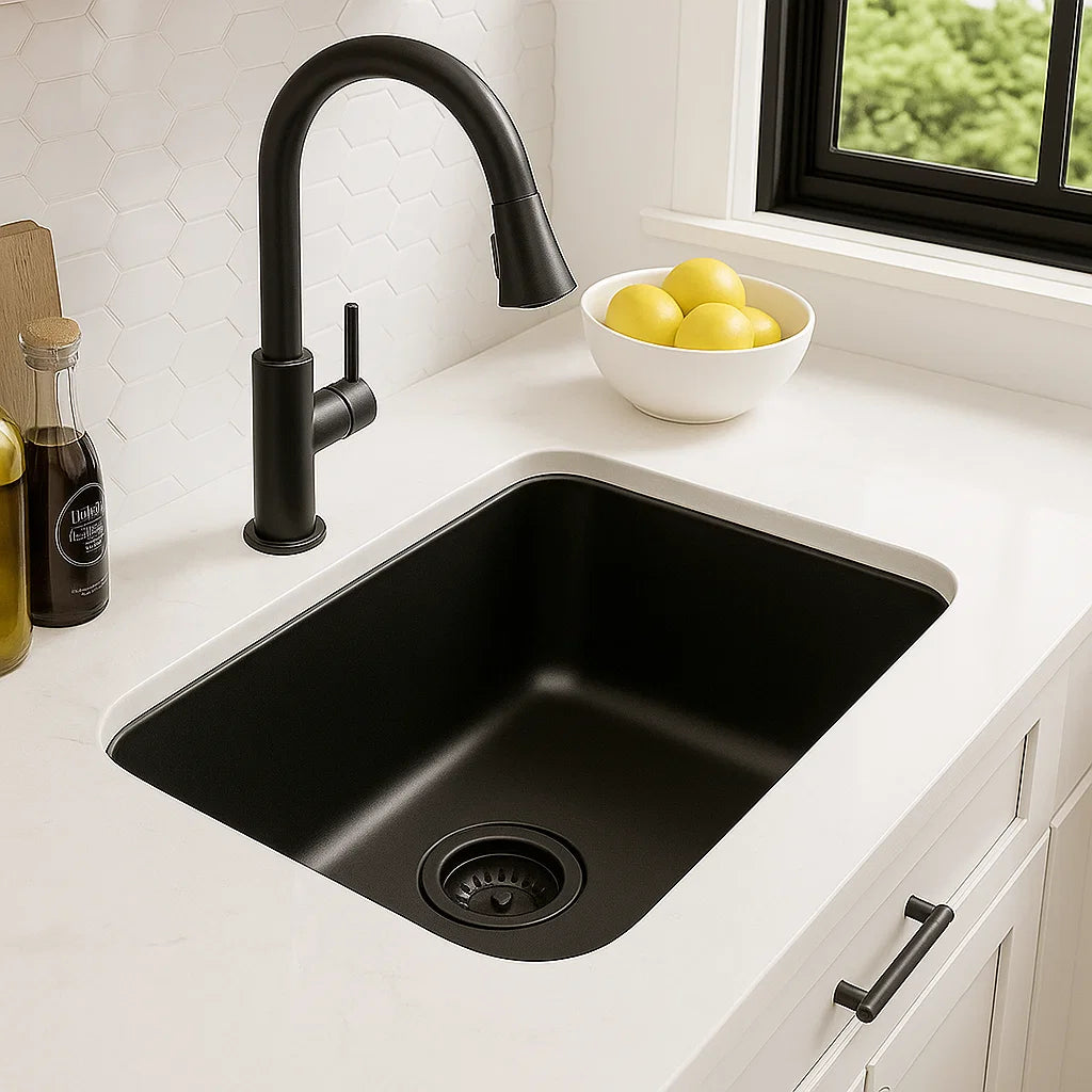 Matte black finish provides a striking, coordinated look when paired with black stainless steel or granite composite sinks.