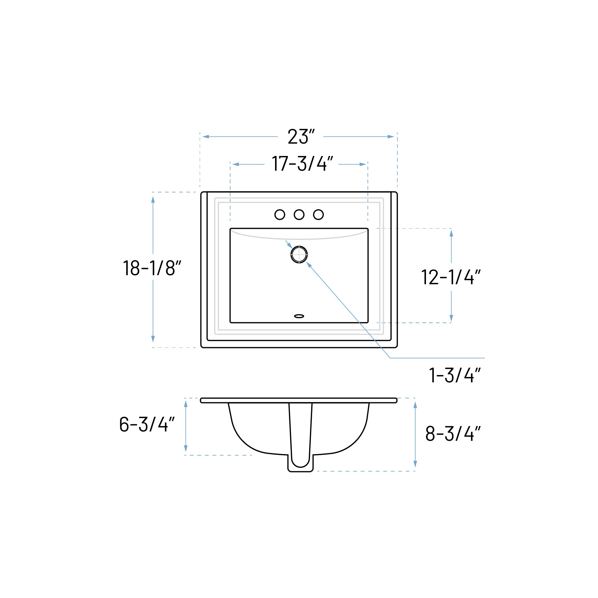 23" Rectangular Porcelain Top Mount Bathroom Sink with Overflow Drain in White, VCS-2318-R-T